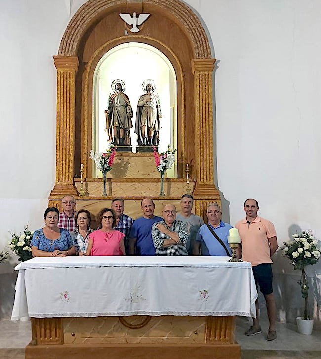 La diputación cartagenera ubicada entre las poblaciones de La Palma, Pozo Estrecho, Miranda y Santa Ana vuelve a tener fiestas patronales en honor a San Cosme y San Damián con una variado programa que se despliega desde esta tarde (19 horas) y el domingo, en el que habrá romería, arroz gigante y más música en la zona de la ermita del siglo XVIII. En la foto, la comisión organizadora, donde colectivos palmesanos han sido los grandes impulsores.