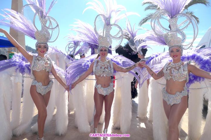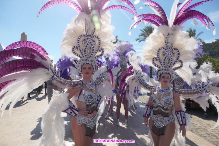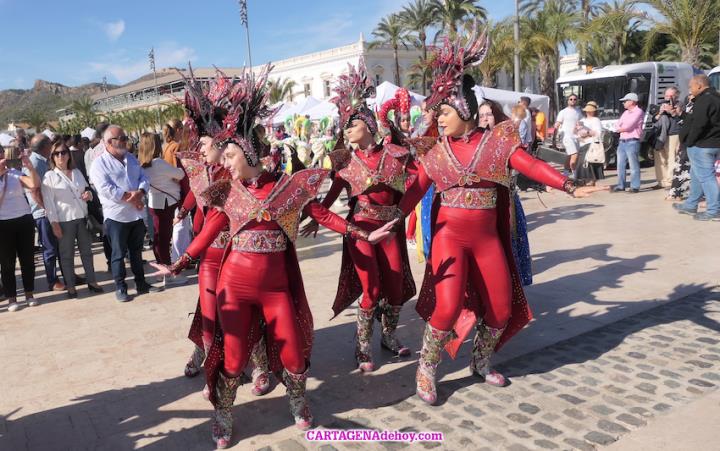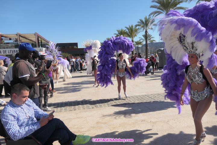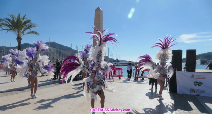 Las actuaciones han comenzado con baile de salón, para después tener lugar un taller de gimnasia, para después ir sucediéndose el canto del grupo Ghana, la medieval coreografía de Renacer y la exhibición de las chicas de Salgueiro (incluida la reina del Carnaval 2024) con sus espectaculares plumas. Estos dos últimos grupos nombrados han llevado a cabo un desfile por la explanada.