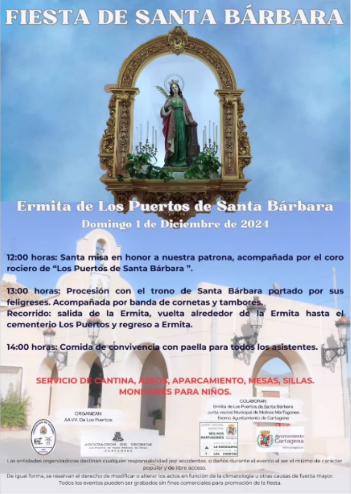 A las doce del pasado domingo comenzó la misa en la ermita que hay entre los dos pueblos, la cual contó con las voces del coro rociero de 'Los Puertos de Santa Bárbara'. Después, procesión con el trono portado a hombros y acompalado por la Agrupación Musical 'Cartagena 1990'. Llegada a la ermita con convivencia, figurando entre los alicientes una gran arroz y un bingo familiar con buenos regalos. Hubo monitores para los niños.