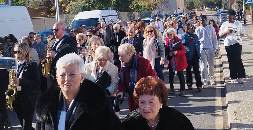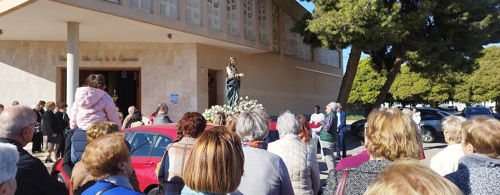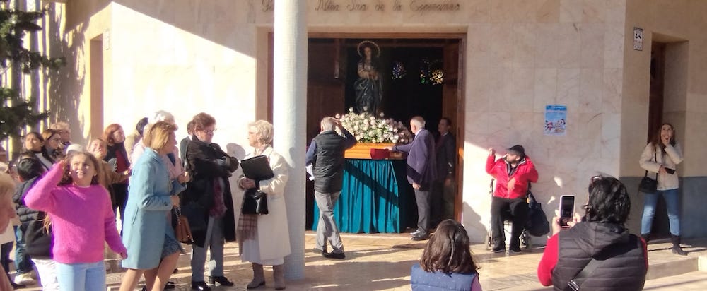 La festividad de la Virgen de la Esperanza este miércoles, 18 de diciembre, pero la procesión en la barriada de Urbanización Mediterráneo se adelantó a ayer domingo con salida desde el templo en el que se rinde culto a la Virgen que representa la esperanza de salvación en medio de las dificultades de la vida.