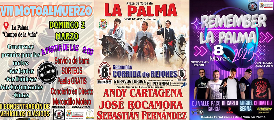 Tras un año 2024 sin festejos en el municipio, regresa el espectáculo del mundo tauriano con la corrida de rejones que tendrá lugar el 8 de marzo en La Palma con los rejoneadoes Andy Cartagena, José Rocamora y Sebastián Fernández, dentro de unas fiestas palmesanas que se celebran del 23 de febrero al 22 de marzo.