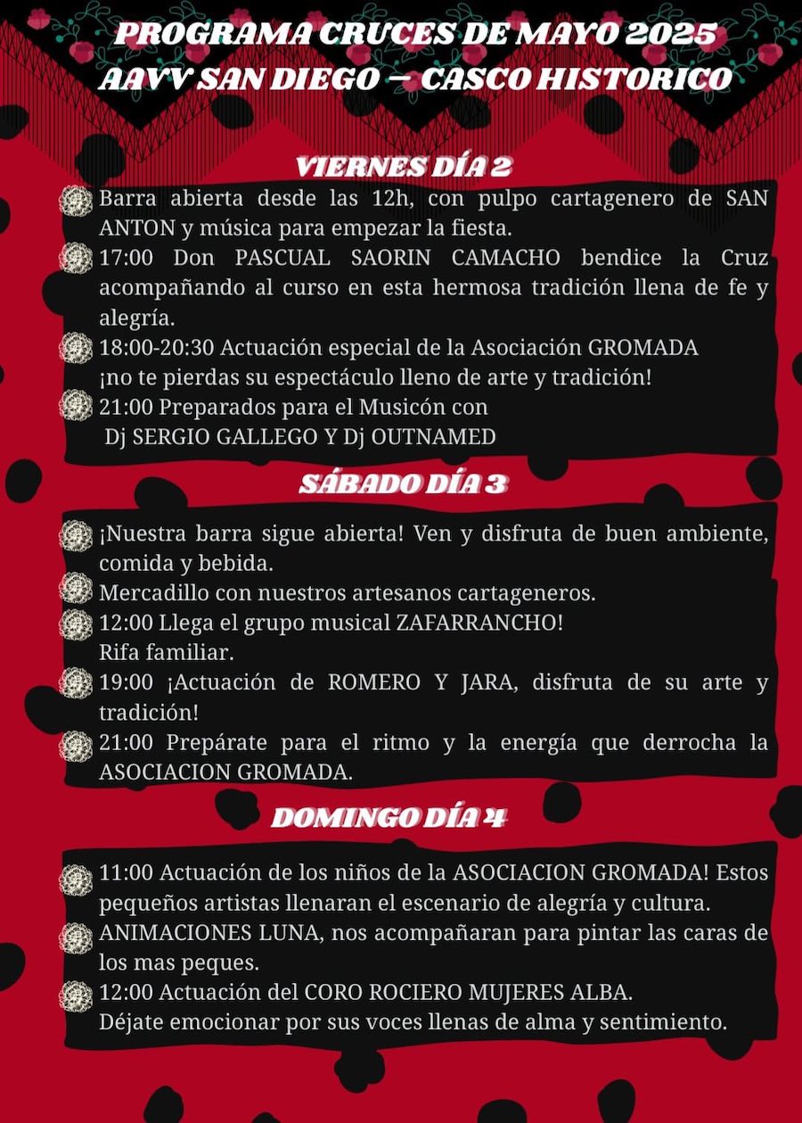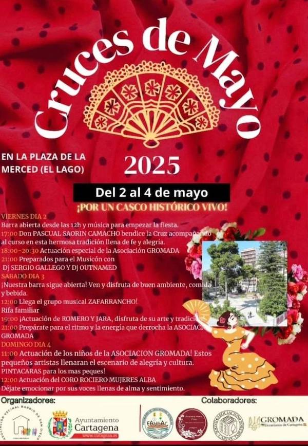 La emblemática plaza de la Merced del casco urbano de Cartagena celebra esta fiesta desde este viernes y hasta el domingo con actuaciones en directo de Gromada, DJ Sergio Gallego, DJ Outnamed, Zafarrancho, Romero y Jara y Mujeres Alba, entre otras propuestas. Organizan la asociación de veicnos Barrio de San Diego y el ayuntamiento con la colaboración de la Federación Vecinal, Mujeres Carmesí y Gromada.