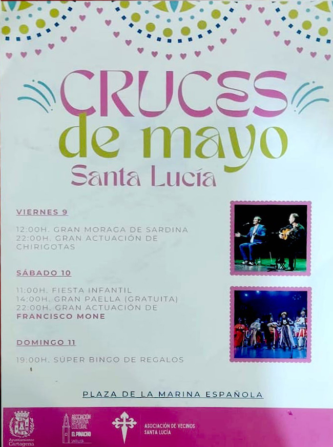 ADC El Pinacho, asociación de vecinos y ayuntamiento hacen posible tres días de actos en la plaza de la Marina Española del 9 al 11 de este mes, destacando las actuaciones de una chirigota, del cantaor cartagenero Francisco Mone (foto adjunta) y de la degustació popular de arroz. Todos los espectáculos son gratuitos para los asistentes.