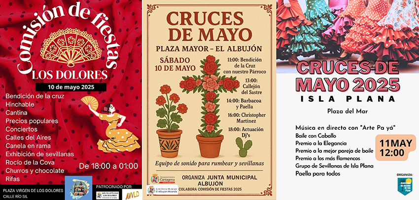 En concreto, durante este segundo fin de semana de mayo, han organizado actividades de las Cruces de Mayo 2025 algunos barrios y diputaciones como El Albujón, El Algar, San Félix, Barriada San Ginés, Los Barreros, El Beal, Los Dolores, Isla Plana, Santa Lucía o el Polígono de Santa Ana, entre otros. El programa completo de cada una de las zonas está disponible adjunto a esta noticia.
