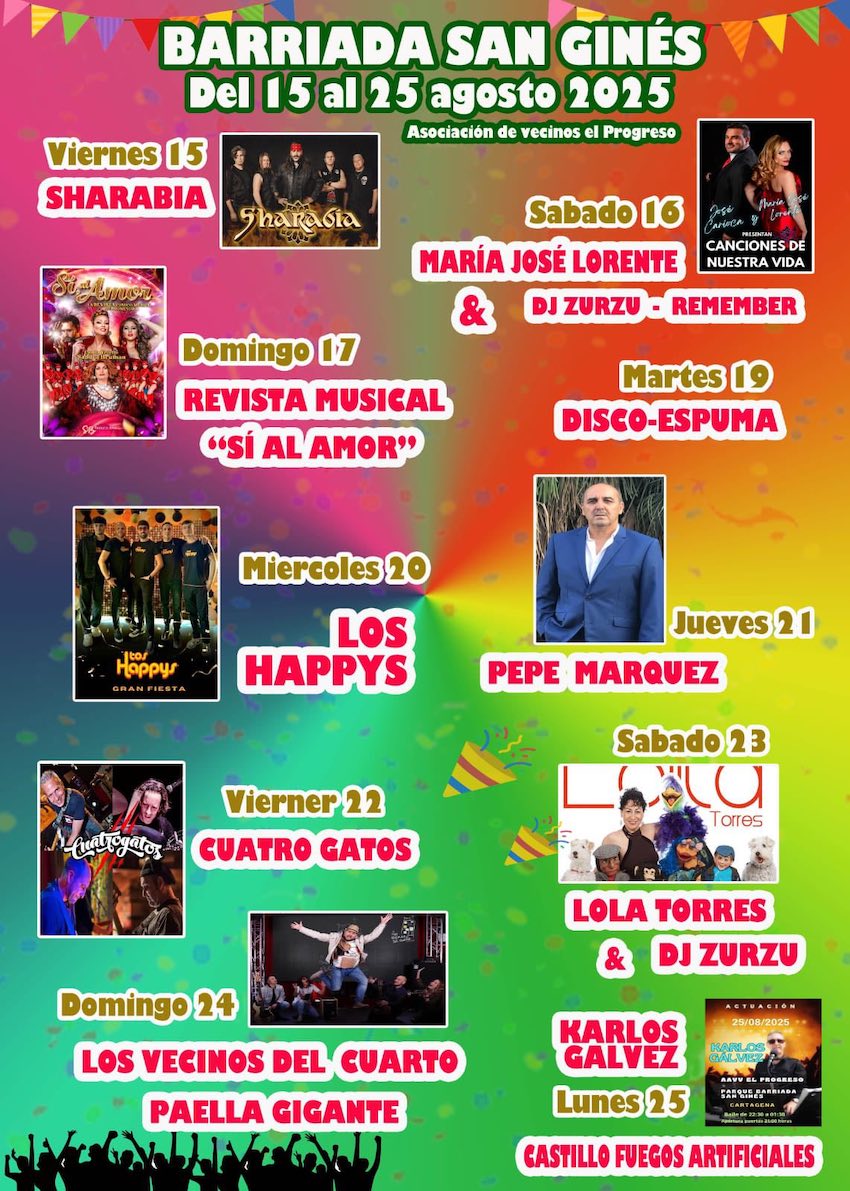Las fiestas patronales en la barriada urbana de Cartagena se celebrarán del 15 al 25 de agosto y también contará con las actuaciones musicales de María José Lorente, Pepe Márquez, DJ Zurzu, 'Los Happys', Karlos Gálvez y 'Los vecinos del cuarto', además de una revista con Sandra Bruman y de la ventrílocua Lola Torres.