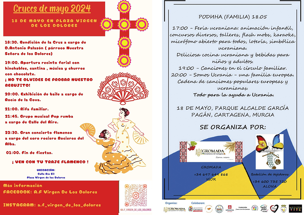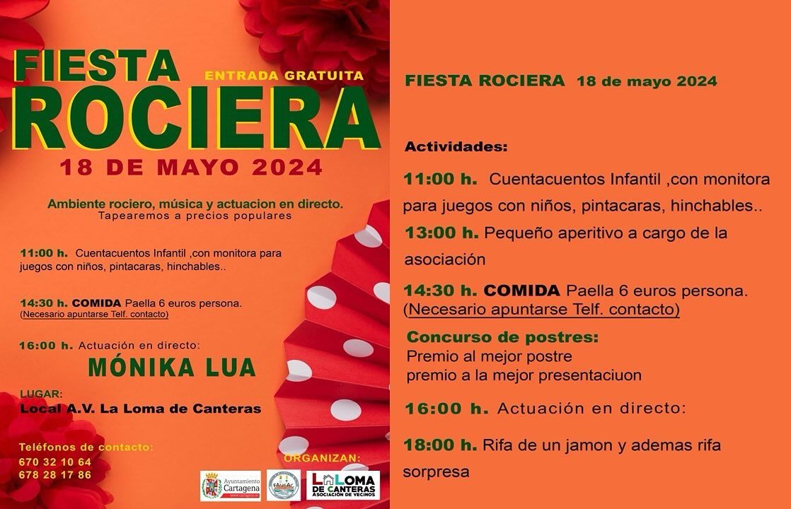 La Loma de Canteras organiza una fiesta rociera, el colectivo 'Gromada' de la comunidad ucraniana en Cartagena celebrará una fiesta familiar en el parque de la barriada de San Ginés y en la plaza más histórica de Los Dolores tendrá la fiesta de 'Cruces de mayo' que organiza el nuevo equipo de la asociación de fiestas.