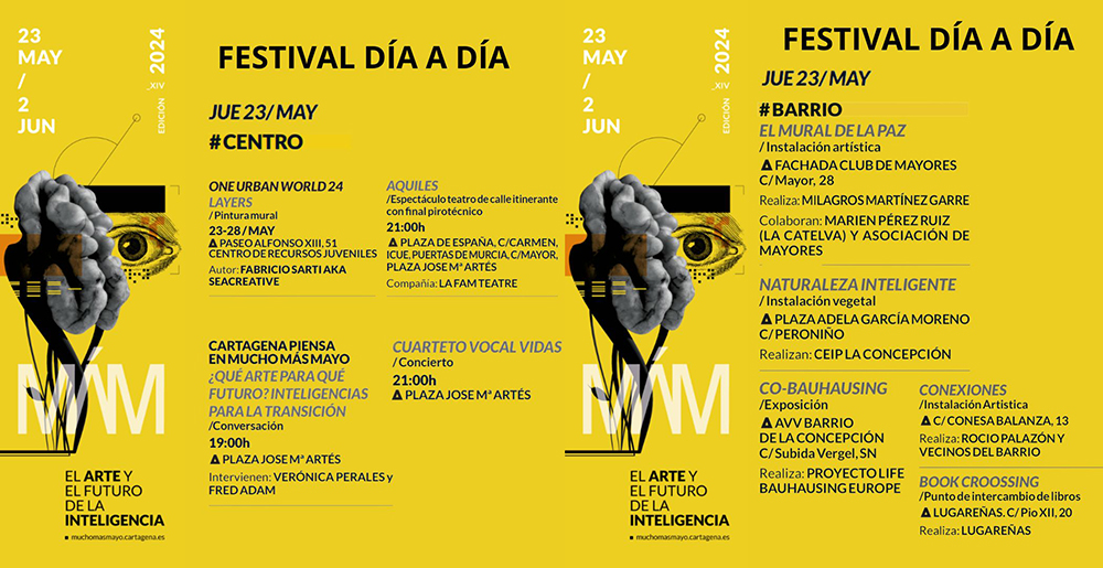 Cartagena acogerá durante los próximos días las 72 actividades que comprenden el programa de la décimo cuarta edición de Mucho Más Mayo. El festival impulsado por el Ayuntamiento de Cartagena comienza esta semana y se desarrolla hasta el 2 de junio en más de una veintena de escenarios. Todas las actividades son gratuitas y el programa observa un equilibrio de género en su composición. La programación se puede consultar en la página web www.muchomasmayo.es