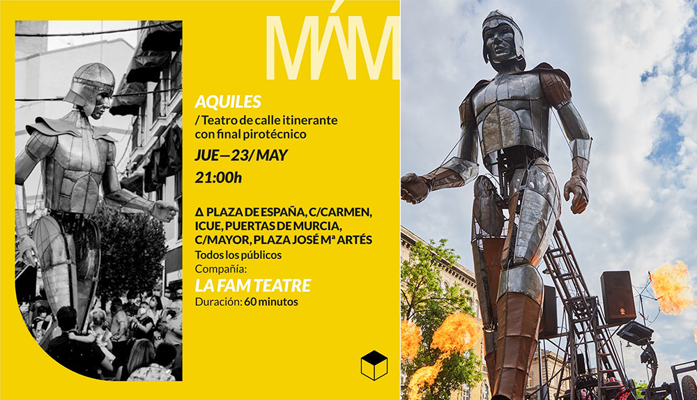 El espectáculo de teatro de calle que inaugurará el jueves 23 de mayo el festival, es Aquiles, de la compañía La Fam Teatre. Uno de los grandes héroes de la mitología griega, el más reconocido de los que lucharon en la Guerra de Troya. Aquiles se adentrará por las calles de Cartagena,en un homenaje a los autómatas míticos que los humanos han soñado desde los antiguos griegos.