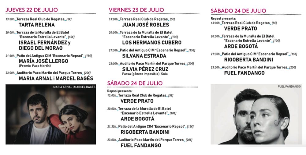 La vigésimo sexta edición del gran festival cartagenero, que este año está dedicado a España, afronta su recta final en los escenarios de auditorio 'Paco Martín' del Parque de Torres, Terraza de El Batel, Real Club de Regatas y el patio del antiguo CIM ‘Escenario Repsol’, al que corresponde la imagen adjunta del concierto de Raúl Refree y Niño de Elche.