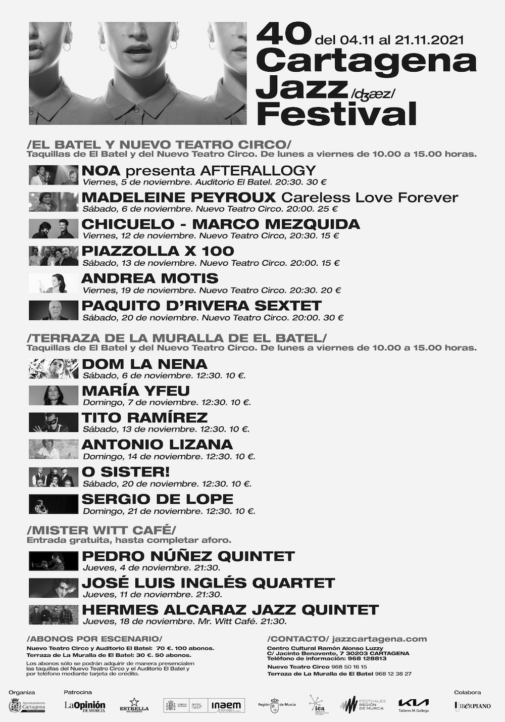 La 40 edición del Cartagena Jazz, del 4 al 21 de noviembre, fue presentada este miércoles 29 de septiembre por la alcaldesa de Cartagena, Noelia Arroyo, en una de las sedes del festival, Mr. Witt Café, donde dio a conocer los cambios que se llevarán a cabo este año: “El público dirá si les gusta o no, y por lo tanto, veremos si se mantienen o no. Hay que ser valientes y probar y tampoco tener miedo a rectificar”