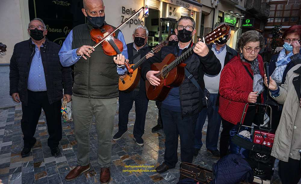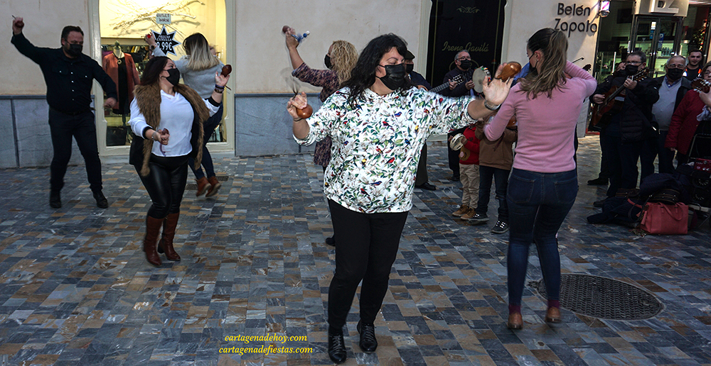 Después de cantar y bailar ante la 'mirada' de las figuras del Monumento al Procesionista, marcharon juntos hasta la plaza del Ayuntamiento, donde ofrecieron más bailes, aguilandos y villancicos al público presente.