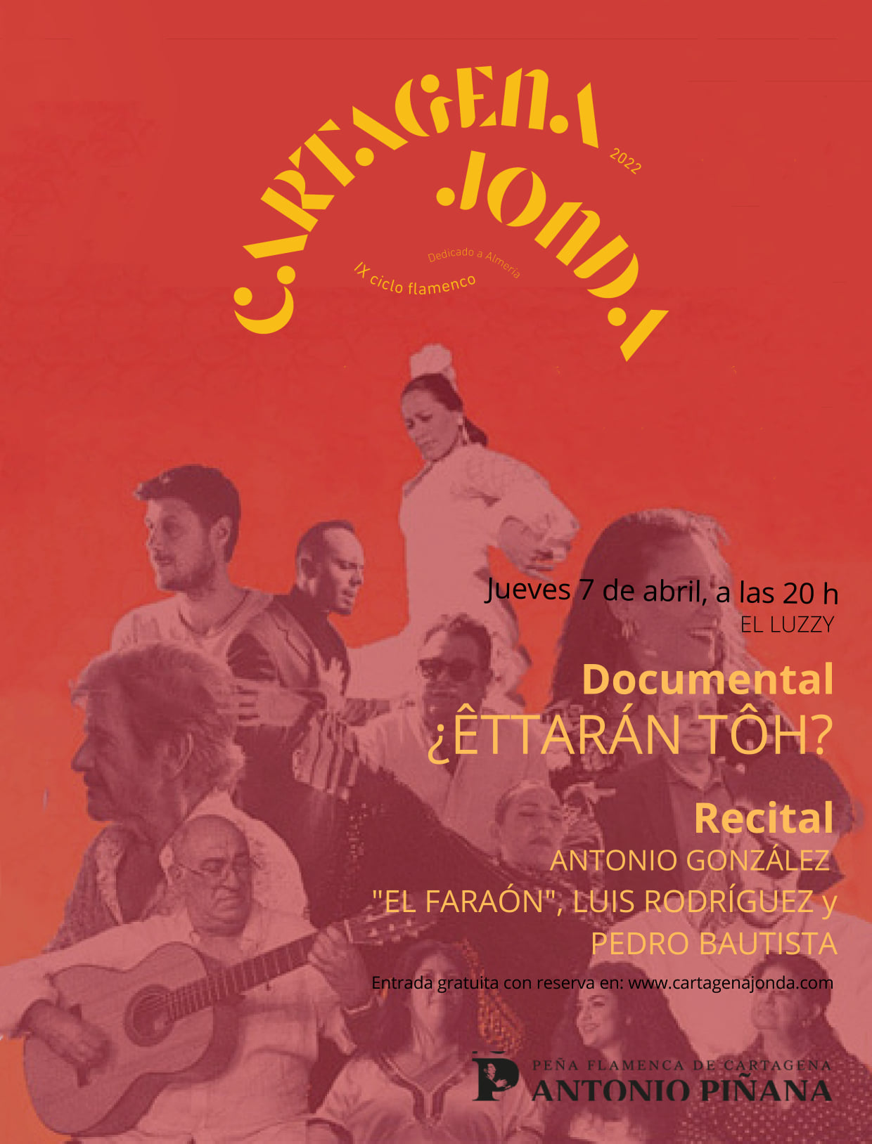 Cartagena Jonda presenta este jueves, 7 de abril a las 20 horas, la proyección del documental "¿Êttarán tôh? 20' al que seguirá un recital de Antonio "El Faraón", Luis Rodríguez y Pedro Bautista. Ambos eventos serán gratuitos y podrán adquirirse las entradas en www.cartagenajonda.com.