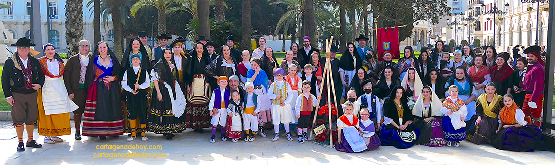 El pintor Pedro Diego Pérez Casanova es el autor de la obra desde la primera edición del evento que organiza el Grupo Folklórico ‘Ciudad de Cartagena’ de La Palma y que se reactivará con la XXVIII edición este próximo mes de julio en El Palmeral de las Casas Grandes (Estación Experimental Agroalimentaria de la UPCT). La imagen oficial de 2022 se conocerá en la noche del 7 de mayo en la Cuesta de la Baronesa de la ciudad, lugar donde el grupo instala una cruz basada en la historia de nuestras tradiciones. Foto del grupo en la ofrenda a la patrona del pasado Viernes de Dolores.