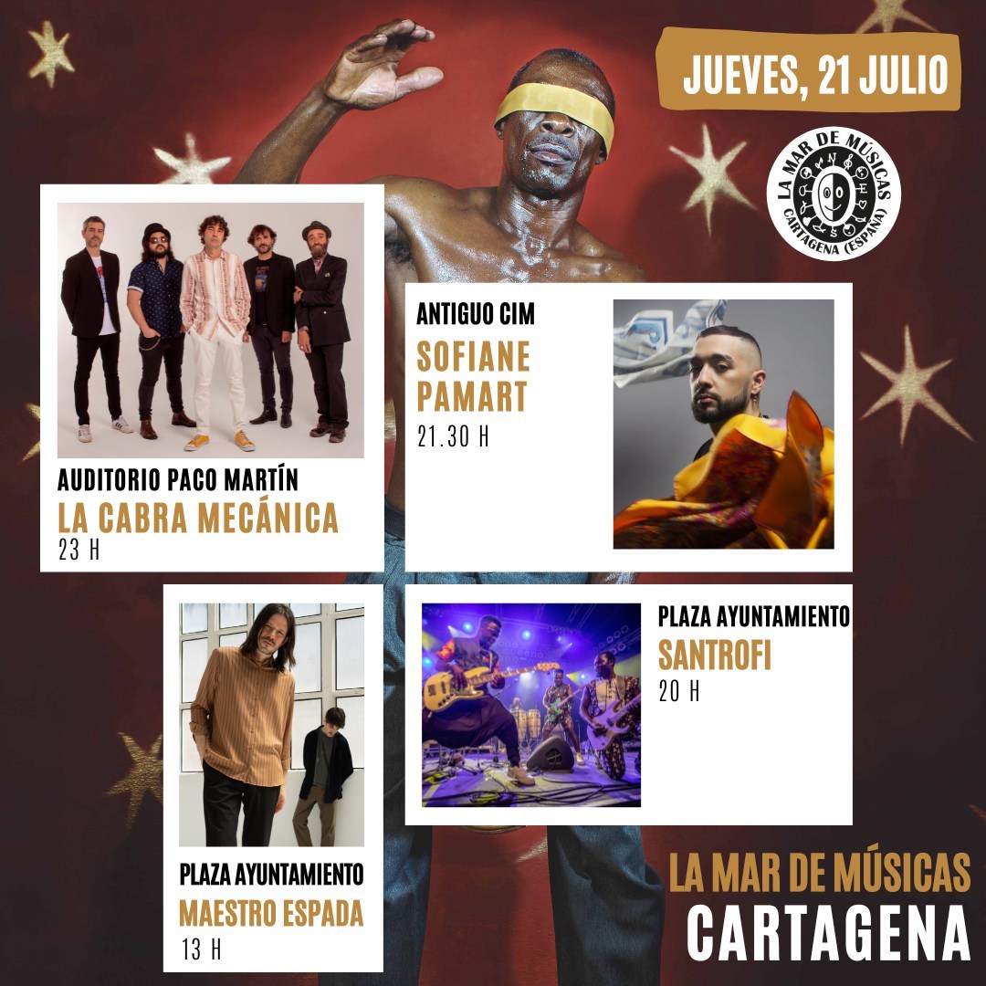Además en La Mar de Músicas concierto de los ghaneses Santrofi en la plaza del Ayuntamiento. Una celebración la música highlife clásica: desde las primeras épocas afrocubanas y las cepas de calipso hasta el funky soul y las influencias nigerianas de los ritmos afro-beat y juju. Antes, en el Real Club de Regatas, Maestro Espada, donde laúdes y castañetas se darán la mano con sintetizadores.