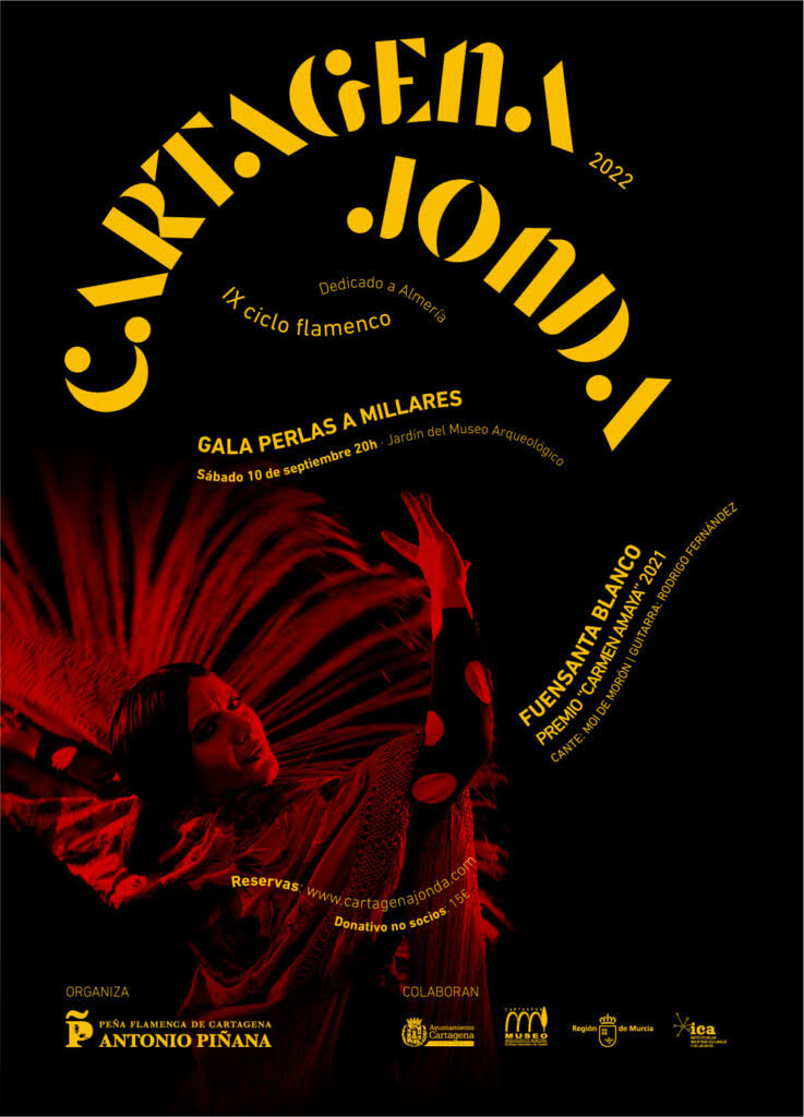 La peña flamenca de Cartagena, Antonio Piñana, organiza el IX ciclo flamenco dedicado, esta vez, a Almería. Este evento dedicado a los amantes del flamenco, tendrá lugar este sábado 10 de septiembre a las 20:00 horas en el Jardín del Museo Arqueológico. Los asistentes, tendrán la oportunidad de ver en directo a Fuensanta Blanco, bailaora premio "Carmen Amaya" 2021, acompañada de Moi de Morón y Rodrigo Fernández. Las reservas podrán hacerse en www.cartagenajonda.com. El donativo para quienes no son socios será de 15€.