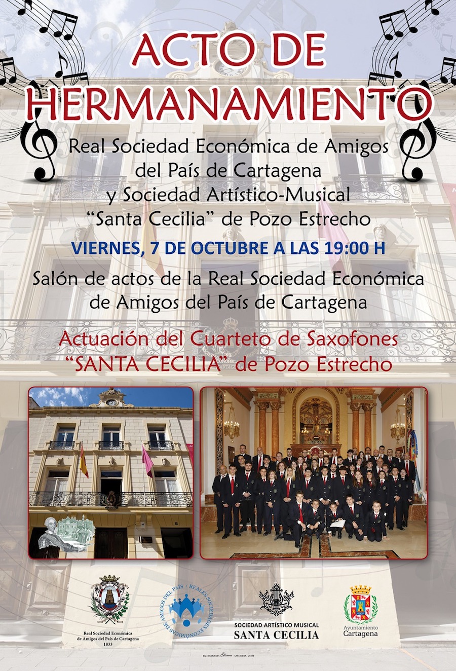 La Real Sociedad Económica de Amigos del País y la Sociedad Artístico-Musical 'Santa Cecilia' han oficial sus fuertes vínculos en un acto que tendrá lugar esta tarde (19 horas) en la sede de la centenaria institución de la calle del Aire de la ciudad y que contará con la presencia de la asociación de Modernistas de Levante y la actuación del cuarteto de saxofones del colectivo galileo.