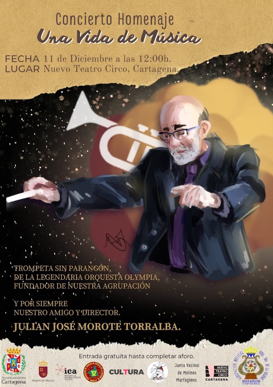 La agrupación musical de Molinos Marfagones ofrecerá mañana, a las 12 horas en el Teatro Circo de Cartagena, un tributo póstumo de gratitud, con el concierto titulado 'Una vida de música', a su querido y 'eterno' director, Julián José Morote Torralba, quien estuvo dirigiendo esta banda desde la fundación de la banda en 1995 hasta su fallecimiento. También se instalará una exposición fotográfica en la entrada. La entrada es gratuita hasta completar aforo.