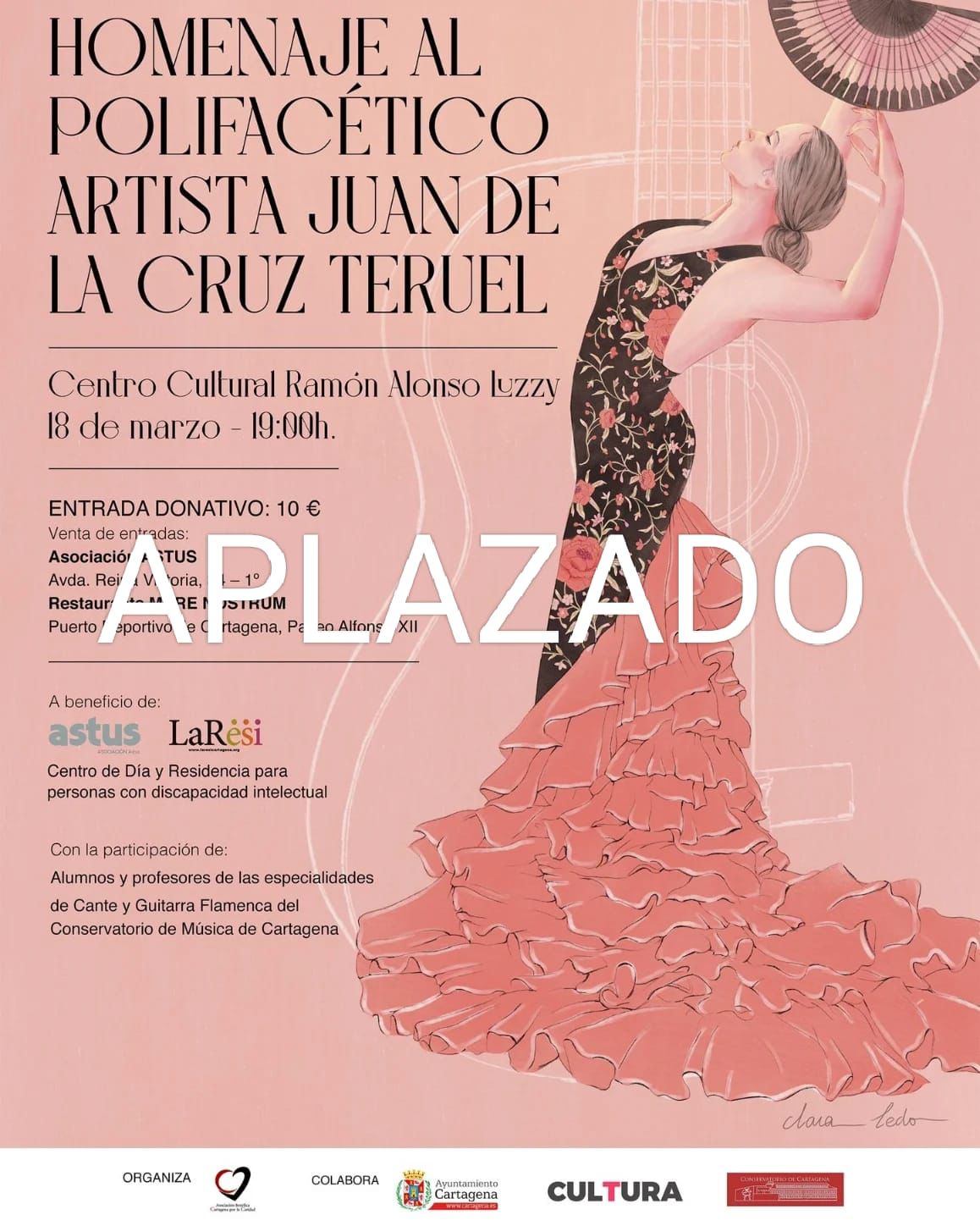 El homenaje al polifacético artista Juan de la Cruz Teruel, que iba a tener lugar el 18 de marzo en El Luzzy con el arte flamenco como protagonista y con al vertiente solidaria de ayudar a Astus, se pospone para más adelante.