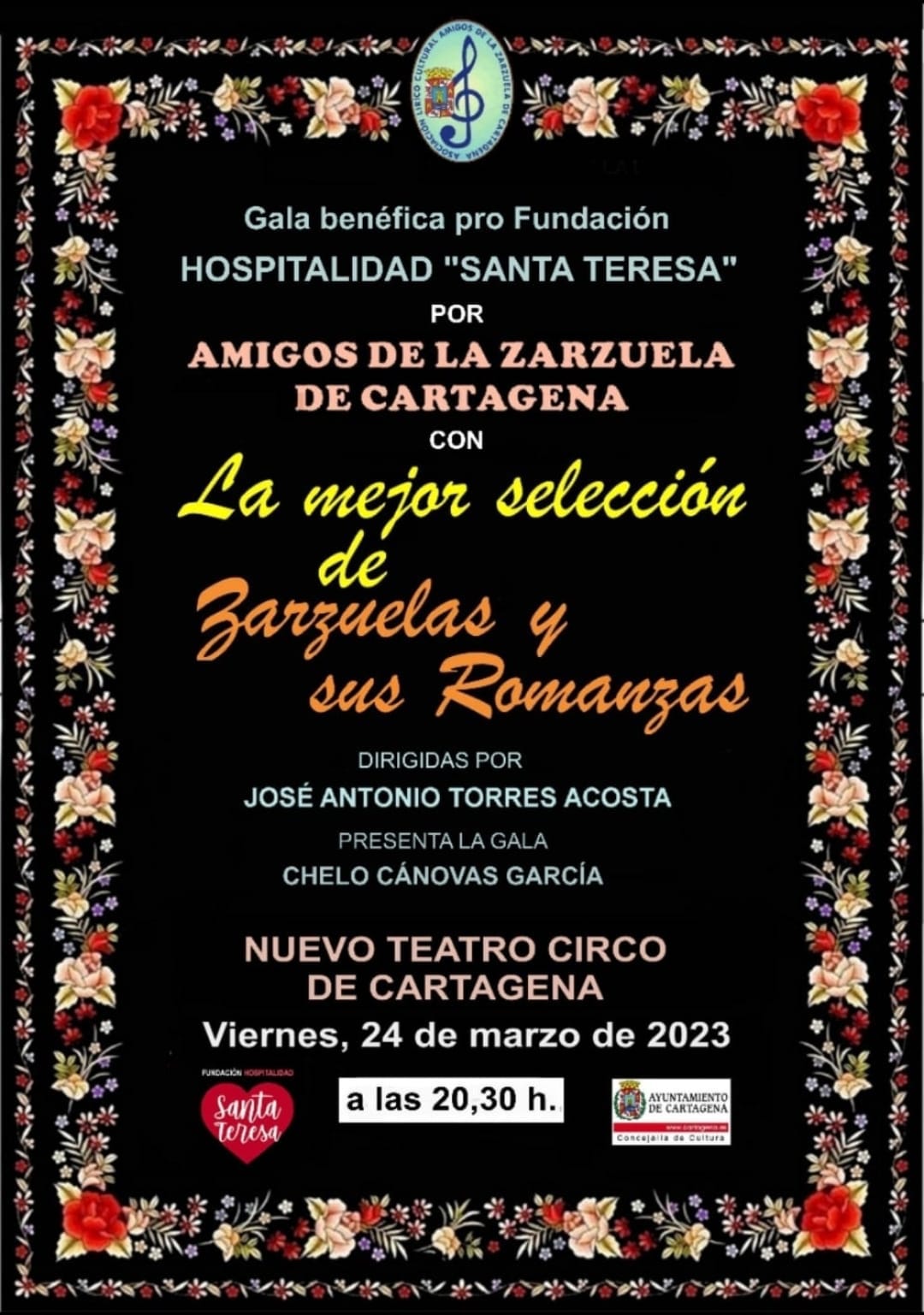 El colectivo 'Amigos de la zarzuela de Cartagena' ofrece esta noche (20.30 horas) el espectáculo 'La mejor selección de zarzuelas y sus romanzas' en el Teatro Circo. José Antonio Torres Acosta dirigirá a un grupo que contará con la presencia de las magníficas voces de la soprano Blanca Luca de Tena y del tenor Víctor Ere. Los beneficios serán destinados a la Hospitalidad de Santa Teresa.