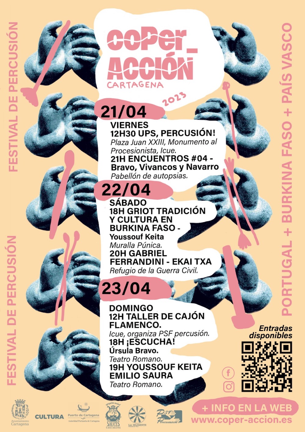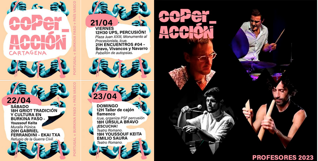 Tradición y vanguardia musical se vuelven a dar cita en coPer_ACCIÓN, el festival de percusión que celebra su V edición, III en el municipio de Cartagena, los días 21, 22 y 23 Abril. La canción tradicional de Burkina Faso, la escena experimental de nuestra capital vecina Lisboa o el folklore del País Vasco. Estarán acompañados por artistas y percusionistas regionales que desarrollan sus carreras a nivel internacional.