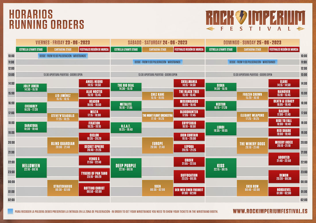 Ya se conocen los horarios para la segunda edición del Rock Imperium Fest. Los días 23, 24 y 25 de junio tendrá lugar la mayor fiesta del rock de todo el levante español, con la icónica e influyente formación estadounidense KISS, una de las bandas de rock más grandes de todos los tiempos, ofreciendo su despedida de los escenarios con una fecha única en España y lo hará en Rock Imperium Fest, en Cartagena. Un festival donde además estarán Deep Purple, Helloween y Europe.
