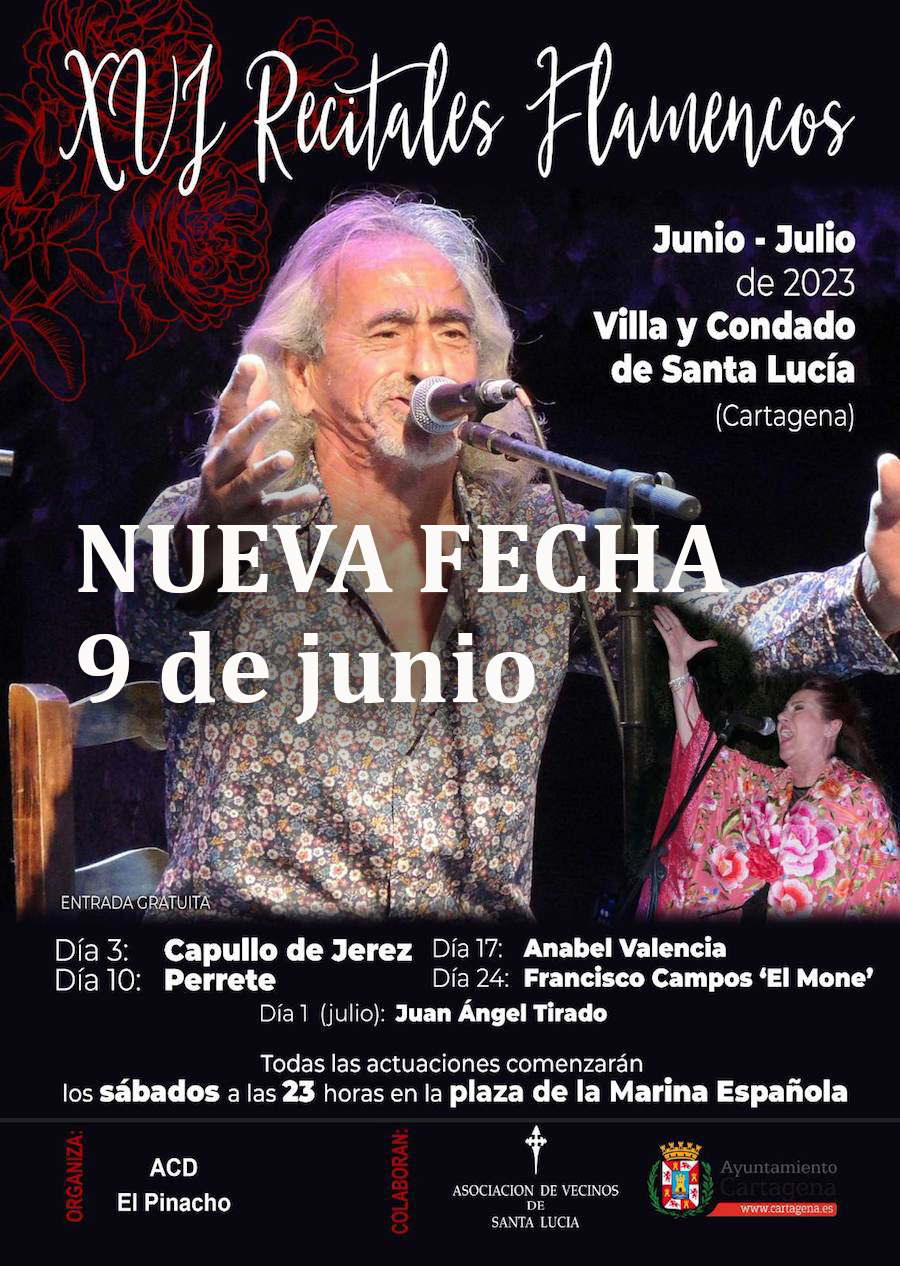 La actuación del cantaor gaditano, que fue suspendida el pasado sábado por previsión de lluvia, se ha fijado para la noche del 9 de junio en la dársena de Santiago en Santa Lucía, con lo que esta semana serán dos las actuaciones de los 'Recitales flamencos' que organiza la ACD El Pinacho, pues el sábado actuará Perrete. Ambos comenzarán a las 23 horas con entrada gratuita.