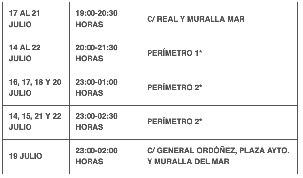 Las zonas afectadas por el ruido durante la celebración del festival se pueden ver en la siguiente tabla: