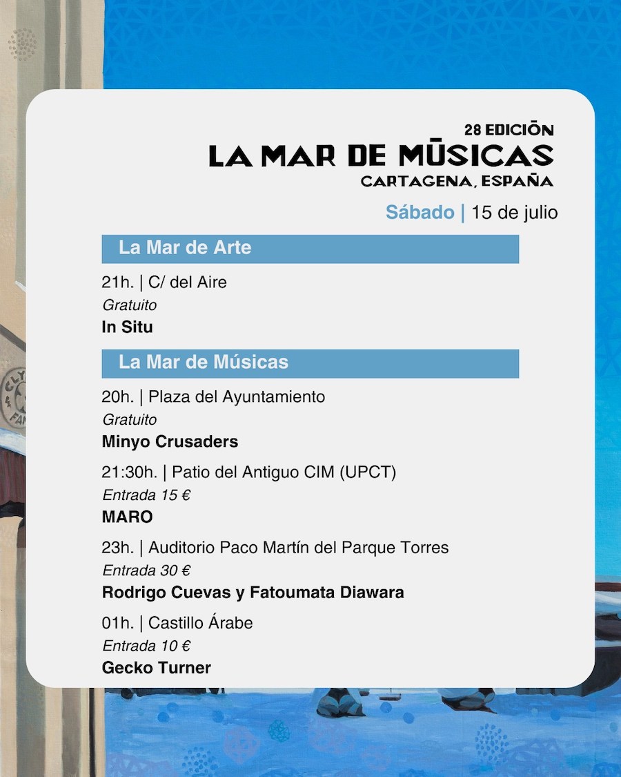 Rodrigo Cuevas vendrá a presentar su nuevo espectáculo el que presentará el disco que ha creado junto al productor Eduardo Cabra; al igual que hará Fatoumata Diawará con el trabajo que lanzó recientemente, producido por Damon Albarn. La jornada de este sábado, 15 de julio, la completan los japoneses Minyo Crusaders, la portuguesa MARO y Gecko Turner. Toda la información y venta de entradas en lamardemusicas.com