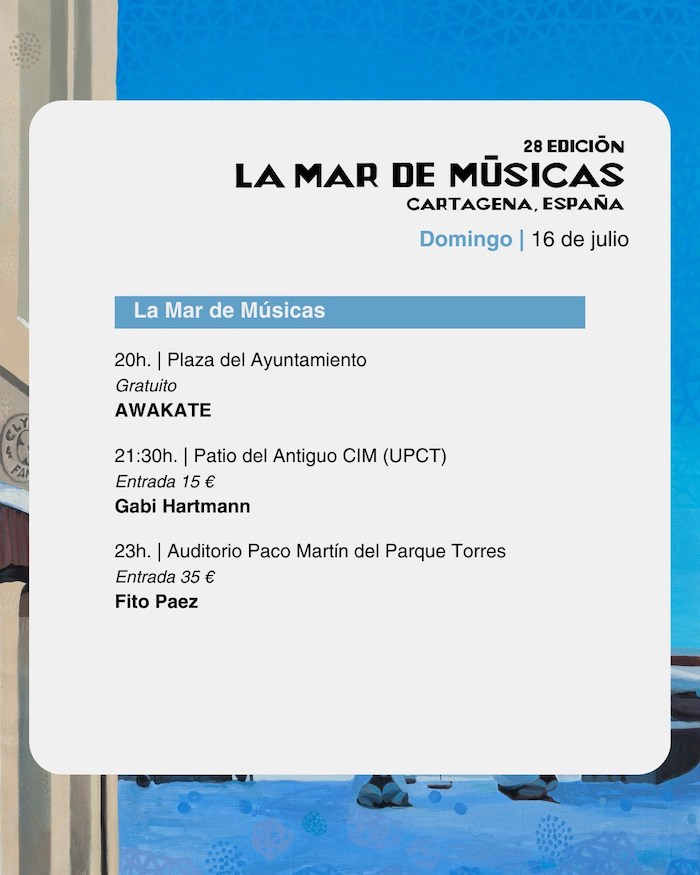 Fito Páez, el trovador del rock argentino, llega a Cartagena para la sesión principal del Parque de Torres de la tercera jornada del festival. Además, Gabi Hartman ofrece en el escenario Repsol su primer concierto en España. Completa la jornada la banda regional 'Awakate' en la plaza del Ayuntamiento.