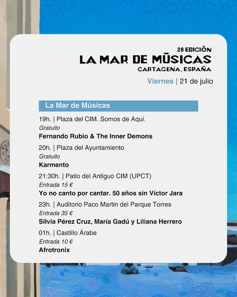Valeria Castro, Isaac et Nora, Muerdo, Club del Río, Luis Pastor, Emilia y Pablo y Luis Barría cantarán las canciones del cantautor chileno Víctor Jara, en un concierto homenaje preparado por el festival La Mar de Músicas de Cartagena, por el que se le rendirá homenaje en el cincuenta aniversario de su muerte. El concierto, producción propia del festival, se celebrará el viernes, 20 de julio, en el Patio del Antiguo CIM. Con las entradas ya agotadas.