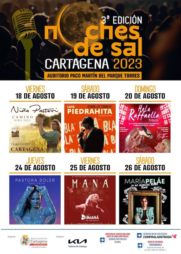 La tercera edición trae a Cartagena a Niña Pastori (este viernes), Luis Piedrahita, Pastora Soler, María Peláe y los tributos a Raffaella Carra ('Hola Raffaella') y a Maná ('+dMANÁ'). Los conciertos, que se celebrarán en el Auditorio Paco Martín del Parque Torres, en la ciudad de Cartagena, tendrán lugar del 18 al 26 de agosto. Las actuaciones darán comienzo a las 22.30 horas, abriendo puertas una hora antes de cada espectáculo.