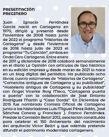El viernes, 18 de agosto, el pregón y la inauguración del evento correrá a cargo de Juan Ignacio Fernández García, uno de los cuatro cronistas oficiales de Cartagena. Este dará paso a Lorena Guerrero que ocupará el papel de maestra de ceremonias, ofreciendo además una actuación musical para todos los presentes.