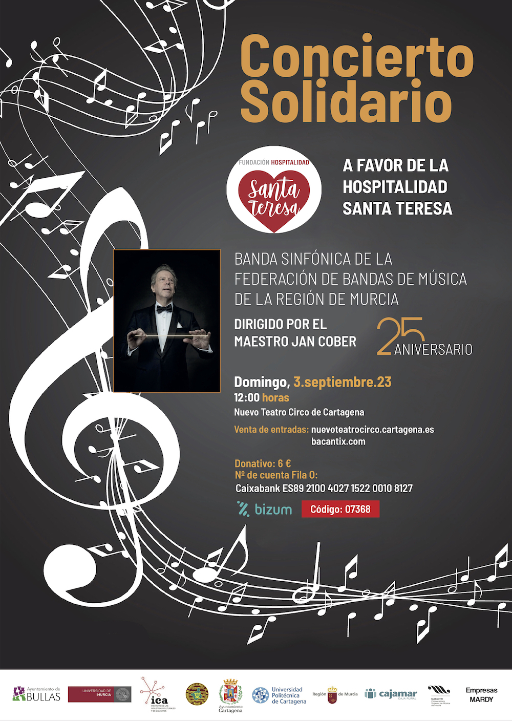 La 'Banda sinfónica de la Federación de bandas de música de la Región de Murcia', dirigida por Jan Cobert, actuará en su 25 aniversario este próximo domingo (12 horas) en el Teatro Circo de Cartagena en un concierto solidario con la institución ubicada en San Antón. El donativo está en 6 euros y se pueden adquirir las entradas de forma anticipada.