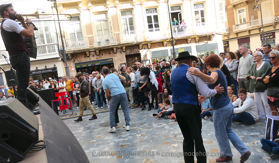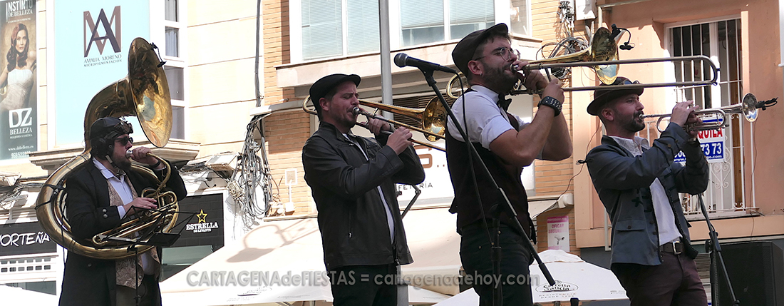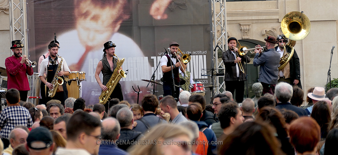 La 'Steam Brass Band' ha protagonizado la segunda actuación callejera del Cartagena Jazz Festival en la plaza del Icue, nuevamente generando un estupendo ambiente aderezado por el 'movimiento de esqueletos' provocado por las canciones que el octeto de músicos ha ofrecido a base de saxos, helicón, trompetas, trombón y batería, demostrando por qué se autodefinen como “una banda divertida y gamberra, de estilo Steam Punk".