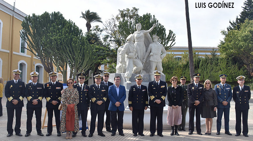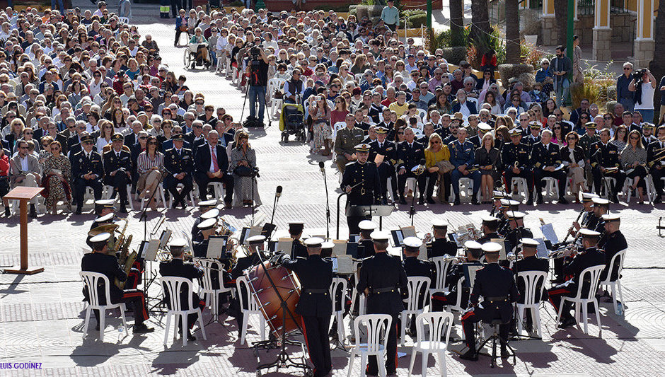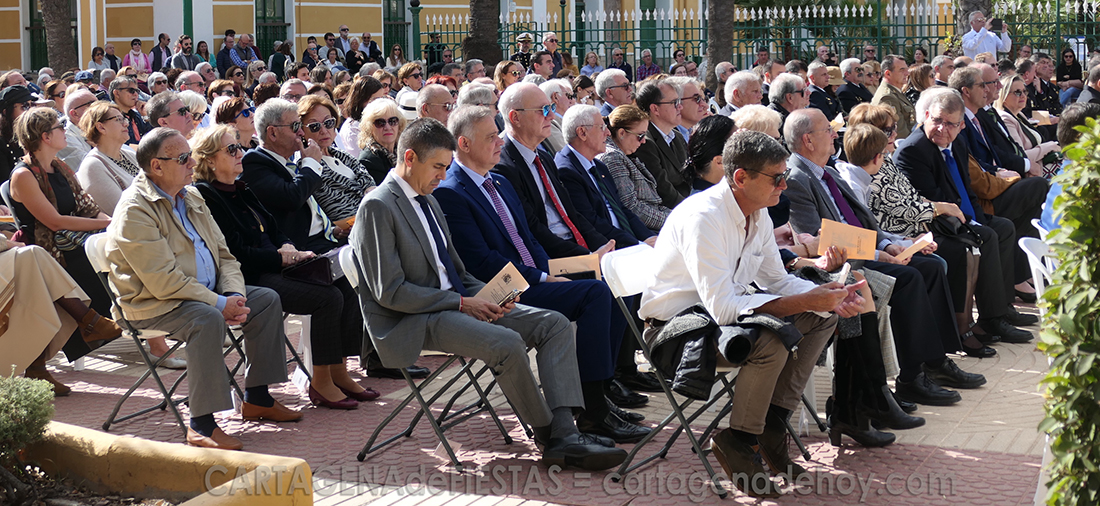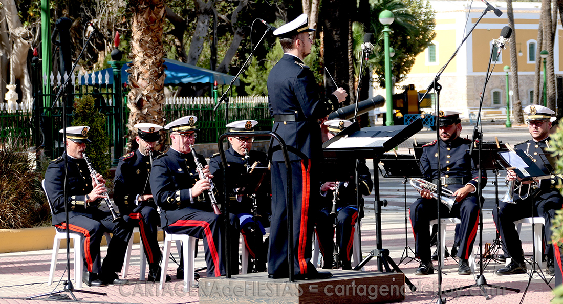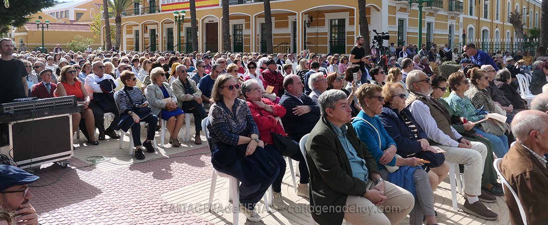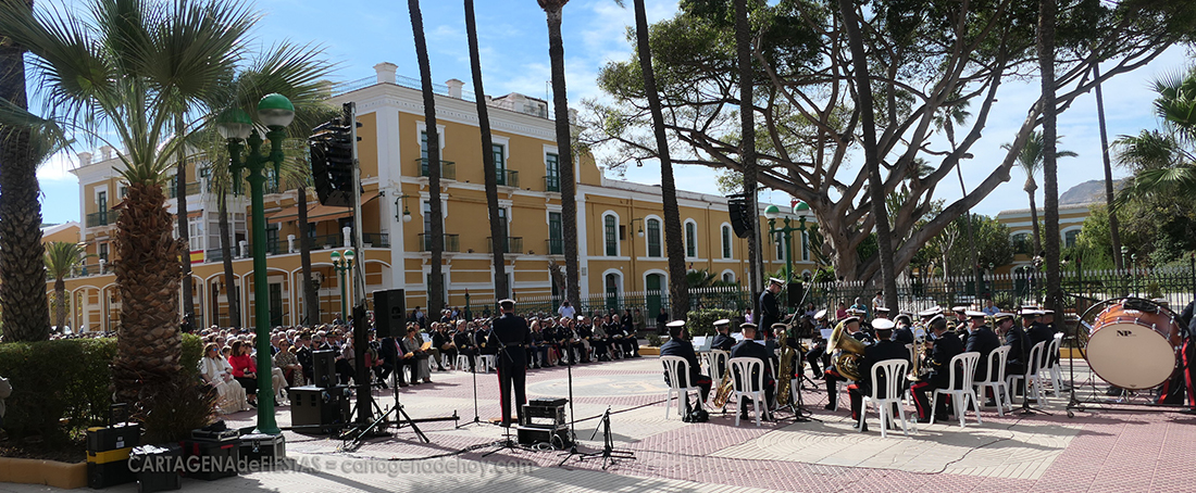 Todas las sillas se ocuparon para escuchar a la unidad de música del Tercio de Levante de la Infantería de Marina en la plaza de Armas, organizado con motivo del centenario de la inauguración del obelisco del puerto, cuyas tallas originales están dentro del recinto militar.