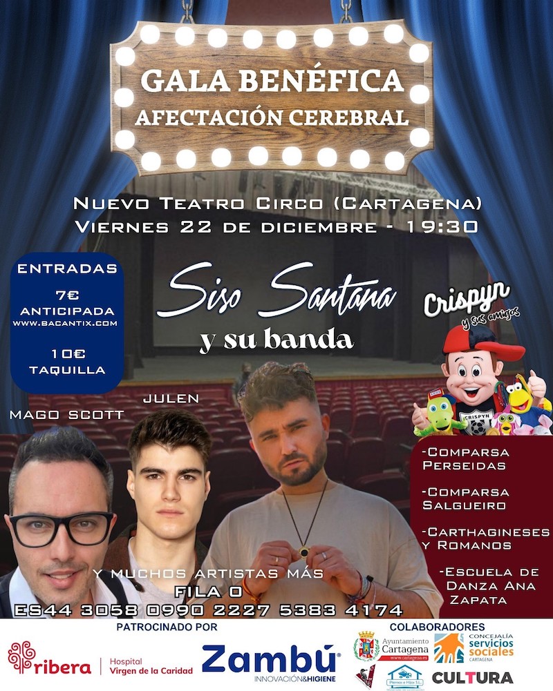Cartagena celebra el viernes, 22 de diciembre, una gala benéfica en favor de familias con menores que padecen afectación cerebral. La velada tendrá lugar a las 19:30 horas en el Nuevo Teatro Circo, gracias a la colaboración del Ayuntamiento de Cartagena. También está patrocinado por firmas como Ribera Hospital Virgen de la Caridad y Zambú Innovación & Higiene.La cita estará amenizada por la música de Siso Santana y su banda. También participarán el mago Scott, el televisivo Julen, la Federación de Tropas y Legiones de Carthagineses y Romanos, y las comparsas de Carnaval Salgueiro y Perseidas. E incluso habrá un gesto del futbolista del Real Madrid, Brahim Díaz.
