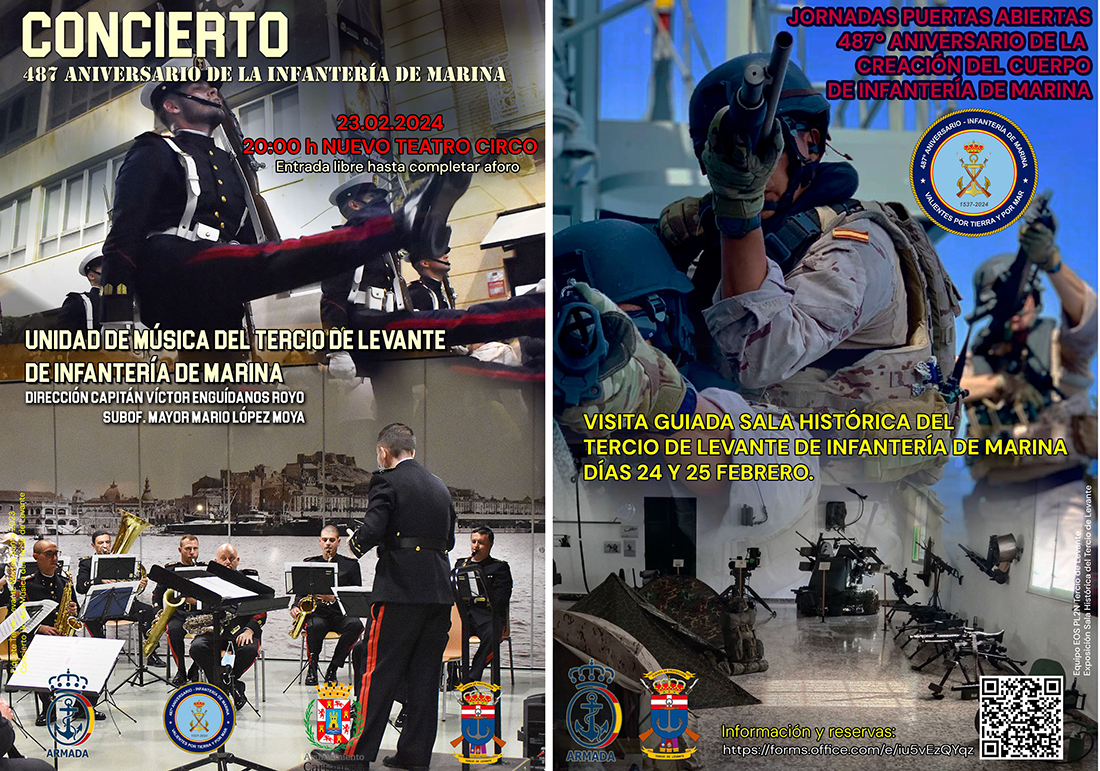 La Infantería de Marina en Cartagena tiene previsto celebrar el próximo día 27 de febrero, martes, el 487 aniversario de la creación del cuerpo, lo que se festejará con una serie de eventos enmarcados dentro de los actos conmemorativos y que comenzarán en las jornadas previas, siendo el viernes el concierto en el Nuevo Teatro Circo y el fin de semana cuando se pueda visitar su sala histórica.