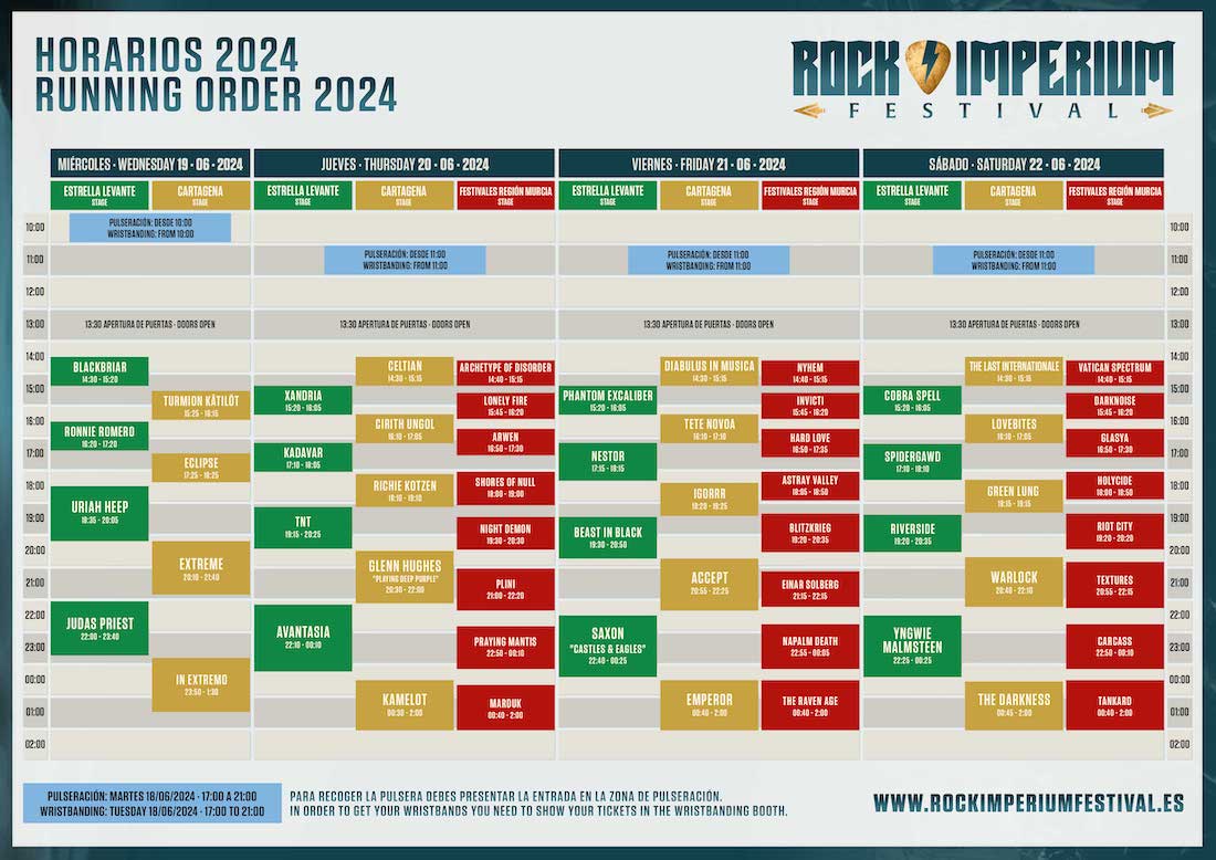 Aunque la apertura de puertas tendrá lugar a las 13.30 horas, es importante tener en cuenta que la pulseración comenzará unas horas antes en la zona designada para tal efecto cada día, incluyendo el martes 18 de 17 a 21 horas. Se recomienda pasar a recoger las pulseras con suficiente antelación para evitar aglomeraciones y colas innecesarias.
