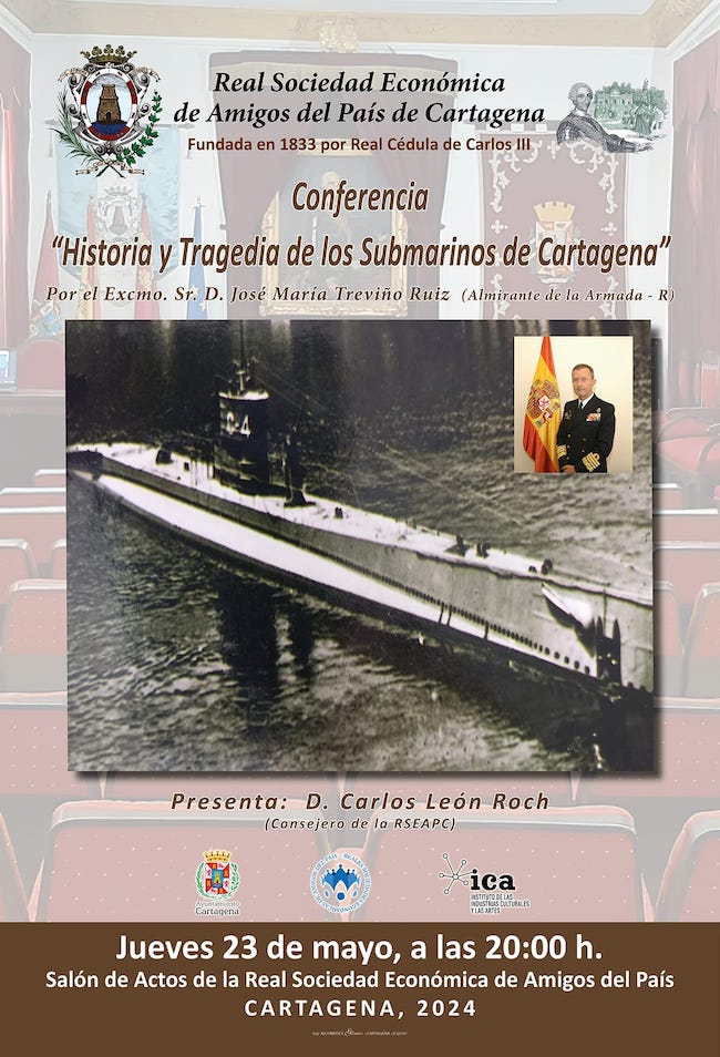 José María Treviño Ruiz, almirante dela Armada en situación de retiro, ofrece esta tarde la conferencia 'Historia y tragedia de los submarinos de Cartagena' en la Real Sociedad Económica de Amigos del País, entidad que sigue adelante con esta actividad sus jornadas culturales. Presentará la charla Carlos León Roch (consejero de RSEAPC). Tendrá lugar en el salón de actos, lugar donde el pasado sábado actuó el quinteto 'Aventis' dentro de la 'Noche de los museos'.