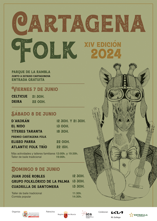 Cartagena se convierte un año más en la capital de la música de reelaboración tradicional del levante español, con la XIV edición de Cartagena Folk. Un festival que ya es toda una institución en la Región, y que pretende seguir consolidándose como referente nacional de festivales de pequeño formato, con una programación variada y de calidad. Todos los conciertos cuentan con entrada gratuita, y se desarrollarán los días 7, 8 y 9 de junio, en el Parque de La Rambla, junto al Estadio Cartagonova.