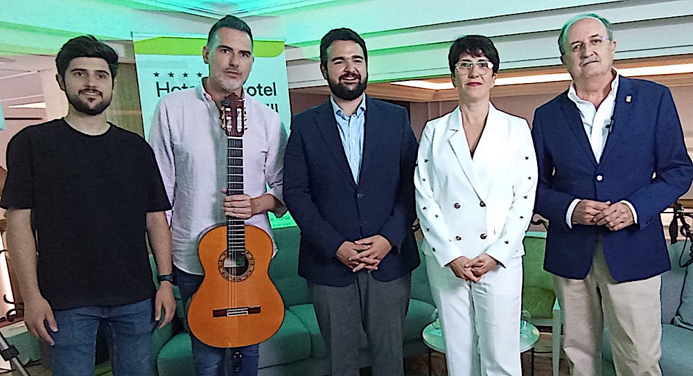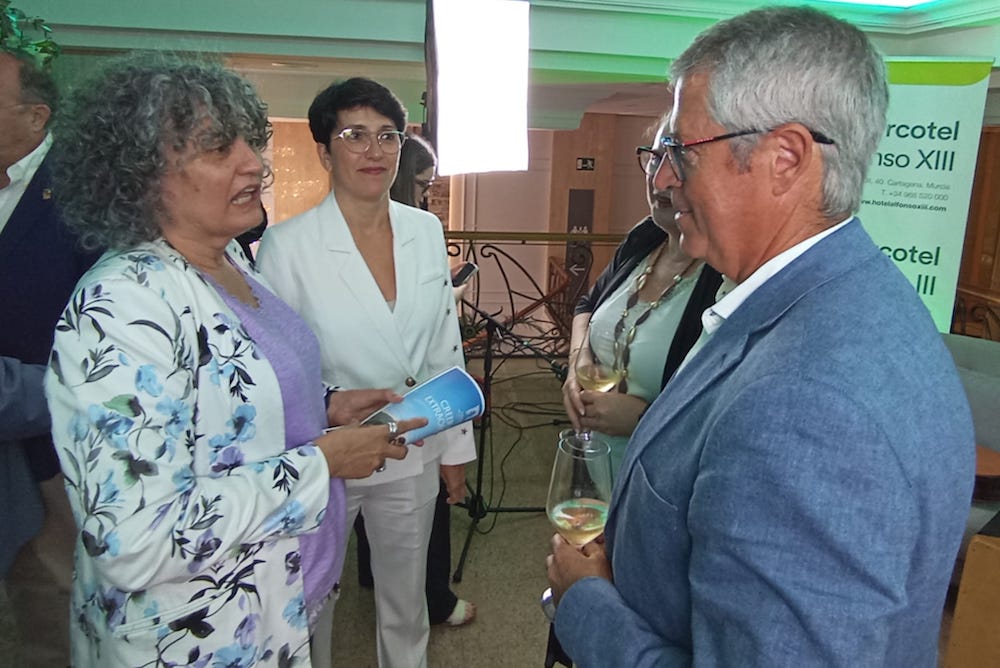 El festival internacional de La Unión ha sido protagonista en un 'podcast' en el Hotel Alfonso XIII al que han asistido un grupo muy seleccionado de personas influyentes de la ciudad y que ha incluido un broche musical a cargo de Carlos Piñana y de Alejandro Solano, dos cartageneros premiados en diferentes ediciones del certamen. En la foto posa con el alcalde de La Unión, Tomás Martínez Pagán y Eva Gargallo.