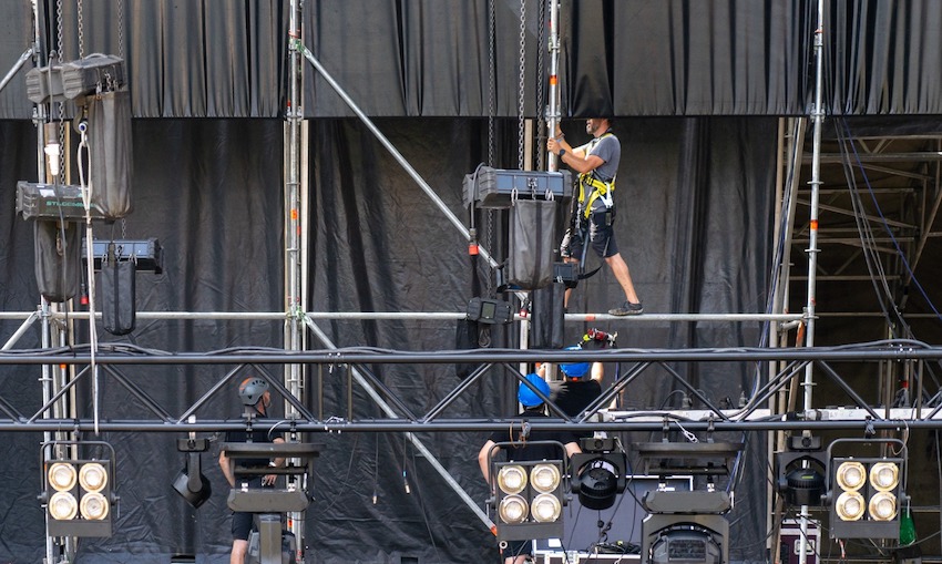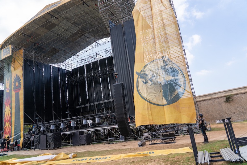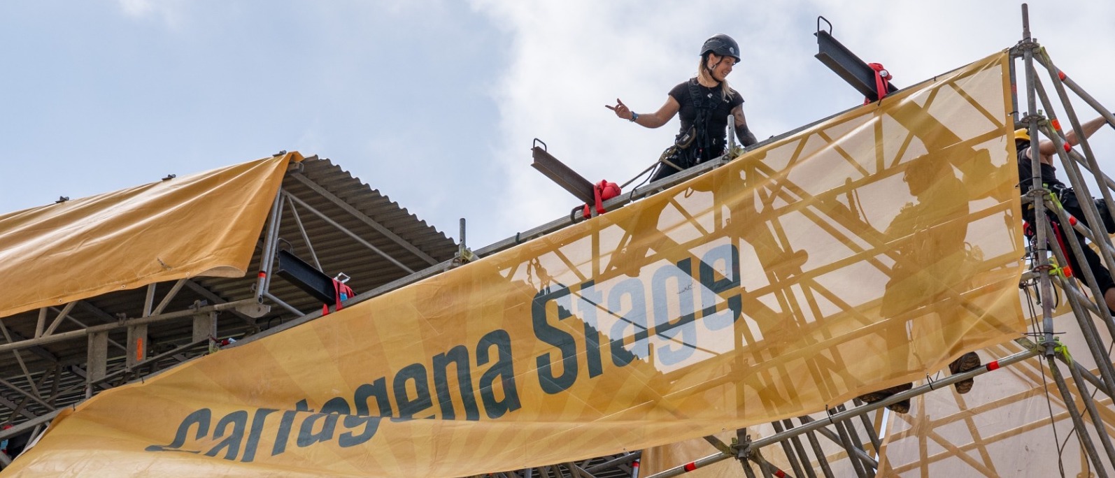 El recinto de la Cuesta del Batel se ha ampliado este año a 50.000 metros cuadrados, estando presidido por dos magnos escenarios cuyas alturas superan a la muralla junto a la que se encuentran, por lo que está precisando trabajos arriesgados, que se llevan a cabo con las medidas de seguridad reglamentarias.