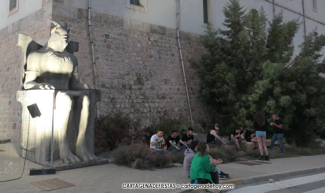El gran marco del 'Cuesta del Batel Arena' está jalonado, durante el 'Rock Imperium Festival', por figuras procedentes de las representaciones y desfiles de las Fiestas de Carthagineses y Romanos. La celebración de los históricos festejos, que tendrán lugar este año del 20 al 29 de septiembre, también se anuncian por las grandes pantallas.