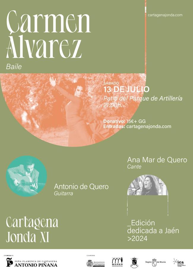 Carmen Álvarez (Arjona, 1994). Esta bailaora flamenca se abre hueco en los escenarios del país, al tiempo que vuelca su carrera en la vertiente pedagógica de la danza, campo en el que da salida a su vocación y reto de transmitir. Antes de eso, se había trasladado a Córdoba, donde estudió Enseñanzas Profesionales de Danza. Acumula experiencia en el prestigioso Centro de Arte Flamenco y Danza Española Amor de Dios de Madrid, donde imparte clases. Con su espectáculo Jerga (estrenado 2022) celebra la contribución histórica de su provincia al mundo del flamenco. Remate, Rastra, Verdeo, Envero, Prensa y Trasiego son las paradas de este viaje por el Olivar.