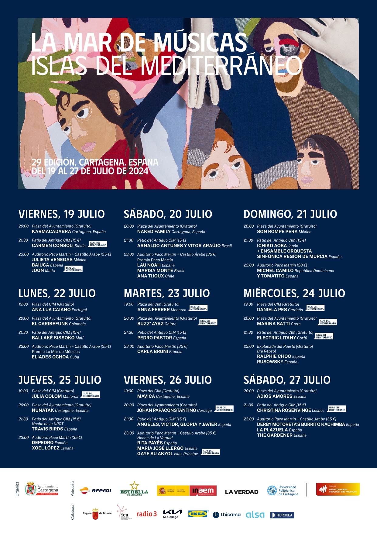 Destaca la presencia de grandes artistas, como la mexicana Julieta Venegas, la chilena Ana Tijoux, el cubano Eliades Ochoa, la brasileña Marisa Monte, la francesa Carla Bruni o el español Xoel López. También hay un sinfín de sonidos isleños por descubrir que sonarán en Cartagena de la mano de la siciliana Carmen Consoli, la maltesa Joon, los chipriotas Buzz' Ayaz, la cretense Marina Satti, o la mallorquina Júlia Colom, entre muchos otros.