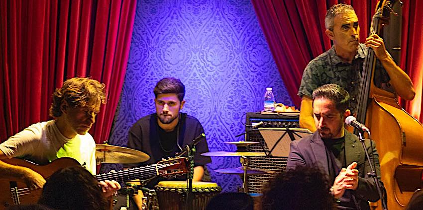 El músico cartagenero, ganador del 'Filón de oro' del Festival del Cante de las Minas de 2019 y a quien se observa en la foto en segunda lugar por la izquierda del lector, inauguró ayer el espacio del '43 Festival de jazz de Cartagena' en El Luzzy con la presentación en su tierra de su primera creación sonora, titulada 'Flamencofusion'.