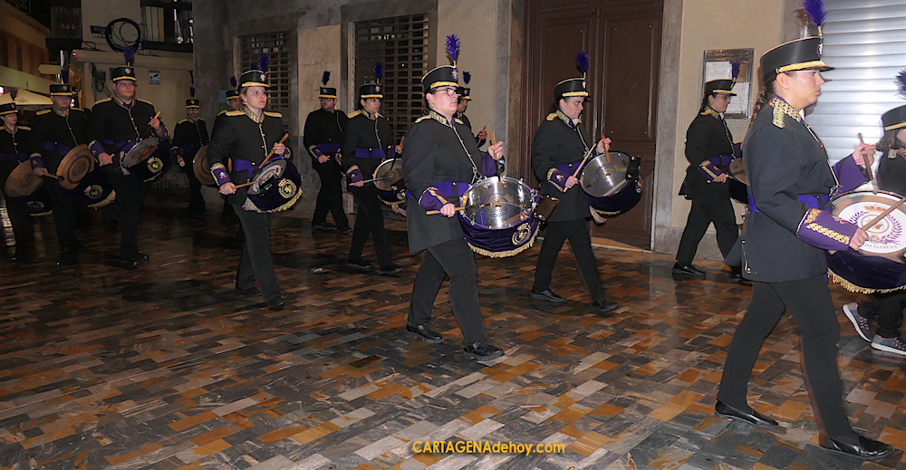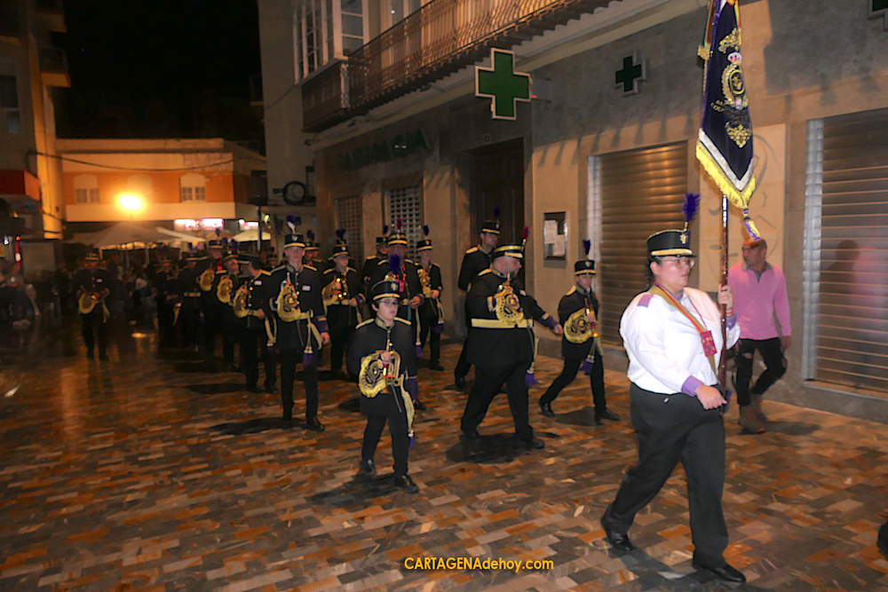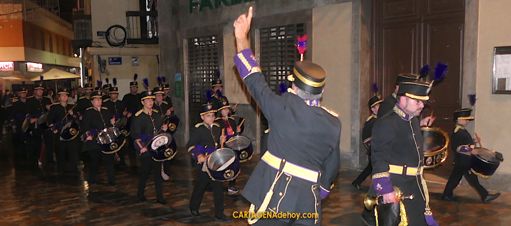 La Virgen del Rosell no salió en procesión debido al chispeo que tuvo lugar en el centro de Cartagena, pero uno de los grupos musicales que la iban a acompañar no perdió la ocasión de cruzar la ciudad en formación. Lo hizo, entre las calles Aire y Caballero, la banda de cornetas, tambores y gaitas 'Educación y descanso-Diego García', cuyo origen es de 1985.