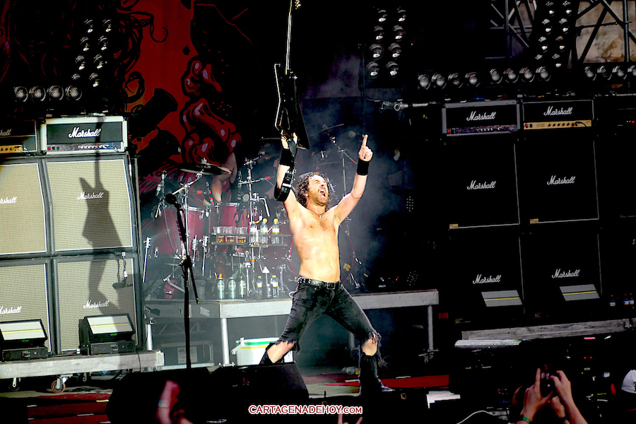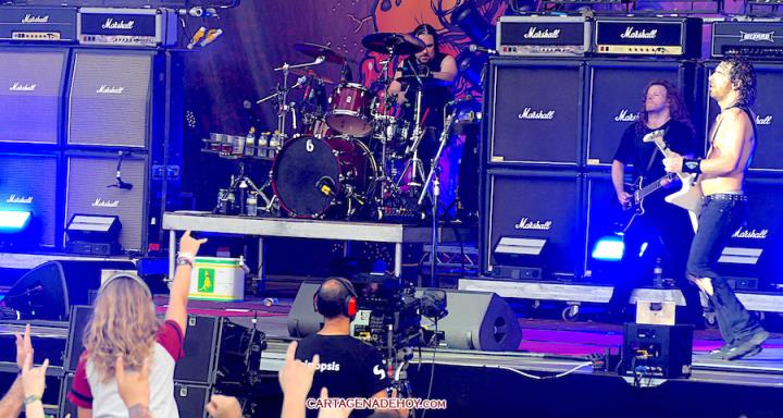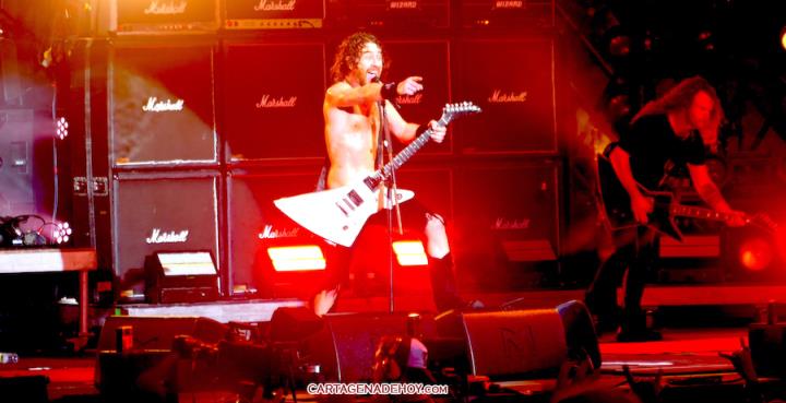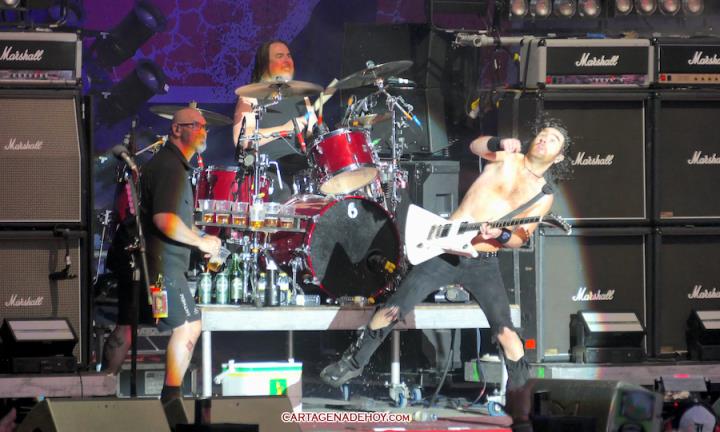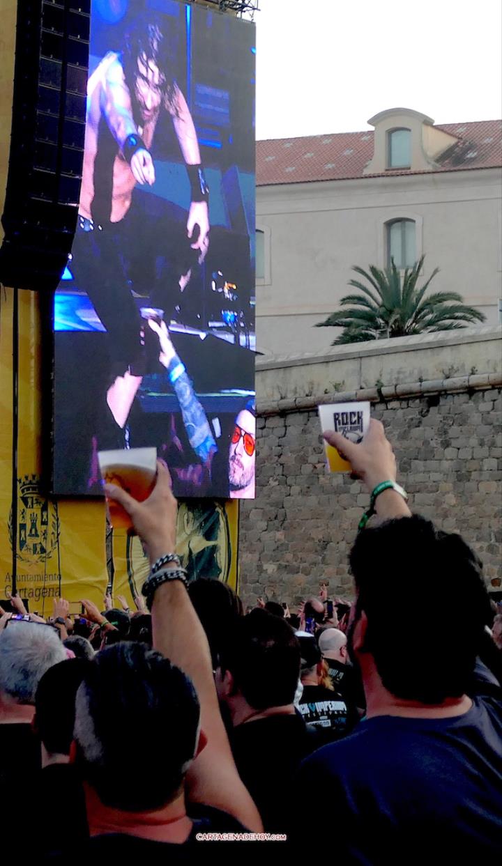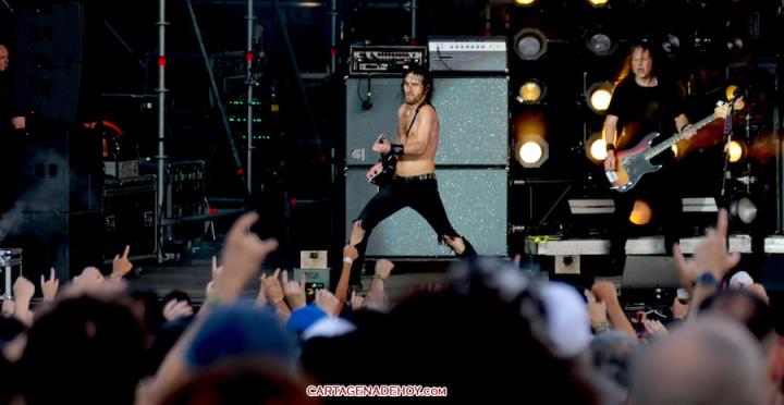Ayer, en la pradera del Batel de Cartagena, se entregó a tope, como bien reflejaba el sudor que brotaba por sus poros y enseguida consiguió una complicidad muy grande con el público, entre el que avanzó sobre los hombros de otra persona. También se le vio preparar güisquis con hielo sobre un altavoz, los cuales repartió después entre sus compañeros. Su generosidad líquida se amplió después lanzando vasos de plástico con cerveza muy bien dirigidos a los espectadores. A todo ello hay que unir sus saltos mientras tocaba la guitarra o acciones como coger un foco y ponerse a iluminar a espectadores. Todo un espectáculo, como bien debe ser un concierto de rock. Otro detalle fue que cuando los músicos abandonaron el escenario, antes de los 'bises', salió Ryan para llamarlos con una bocina. El broche fue la lluvia de tiras de papeles cayendo sobre los espectadores.
