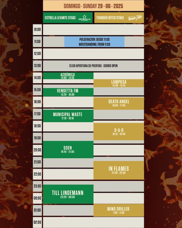 El gran festival rockero de 'La Trimilenaria', que ha atraído a personas de diferentes lugares del mundo, afronta hoy su despedida con una jornada que abrirá 'Acrónica' y que, tras diez actuaciones por los dos gigantescos esceanarios, cerrará 'Mind Driller' en la madrugada, siendo Till Lindermann la principal atracción de este domingo.