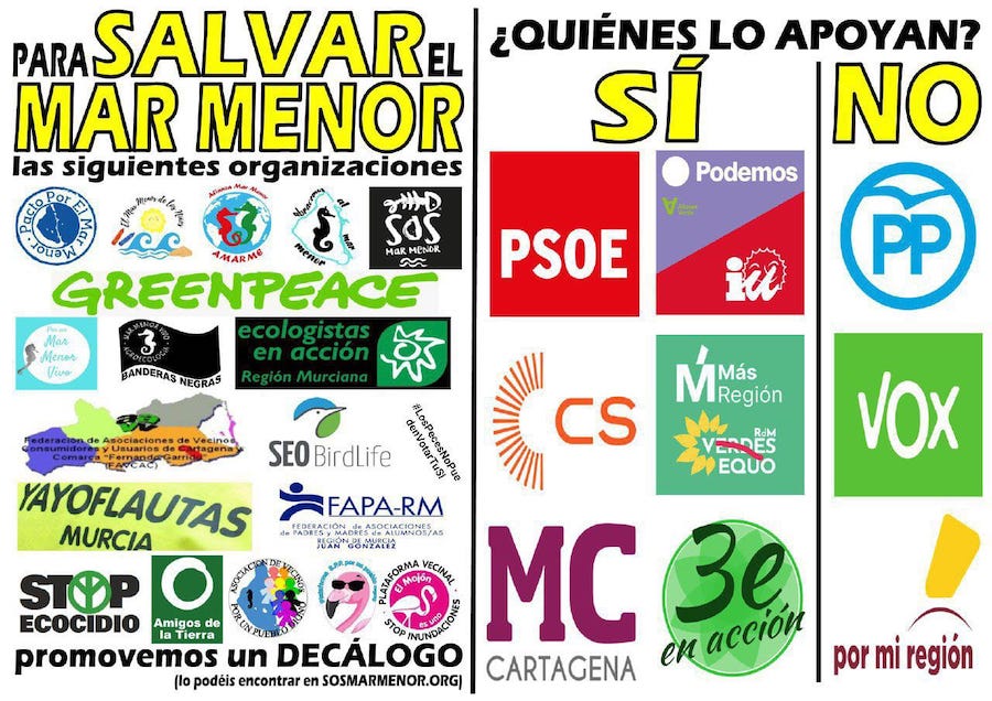 Varias organizaciones ambientales y sociales han desvelado el apoyo presentado por los diferentes partidos y candidaturas que concurren a las próximas elecciones autonómicas y municipales a las líneas trazadas en los 10 puntos por el bien de la laguna salada que presentaron hace dos meses en el Edificio Moneo de la capital murciana. Entre las formaciones que se ha sumado están Movimiento Ciudadano y PSOE, como se observa en las fotos adjuntas.